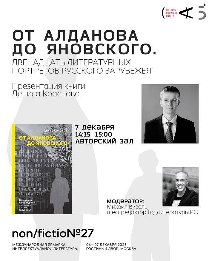 Издательства Nouveaux Angles и «Бослен» представят книгу Дениса Краснова «От Алданова до Яновского. Двенадцать литературных портретов русского зарубежья», в которой собраны очерки, посвящённые писателям «первой волны» русской эмиграции.
