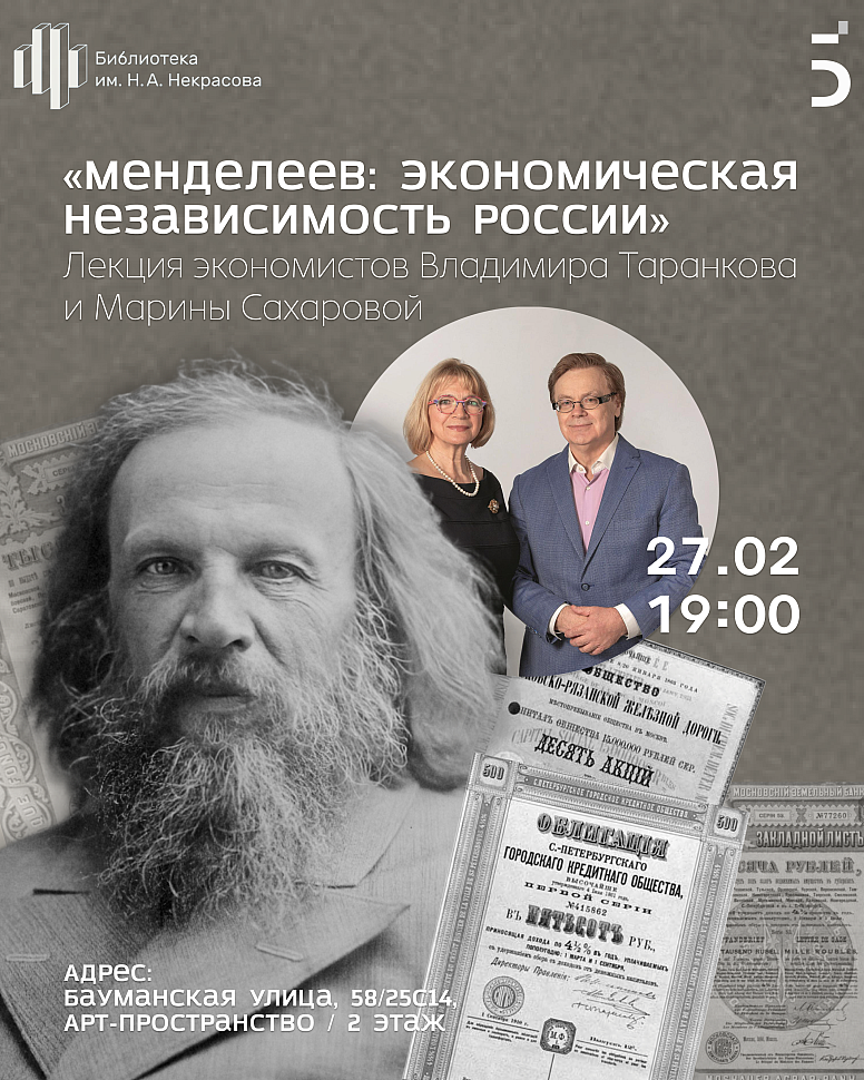 27 февраля в библиотеке имени Н.А. Некрасова состоится лекция-презентация книжной трилогии Владимира Таранкова и Марины Сахаровой, впервые комплексно представляющей экономические труды гения русской науки Дмитрия Ивановича Менделеева.